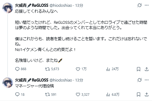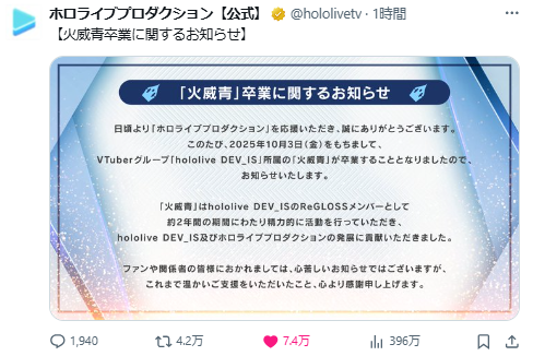 2023 年九月出道的 holoLive VTuber 新團體『hololive DEV_IS ReGLOSS』的成員之一「火威青」,今日 ( 10/3 ) 直接由 Cover 官方宣布畢業,讓不少粉絲大感震驚,兩年的活動期間就此畫下休止符。
