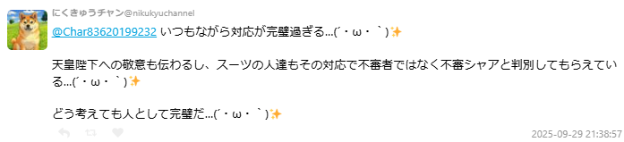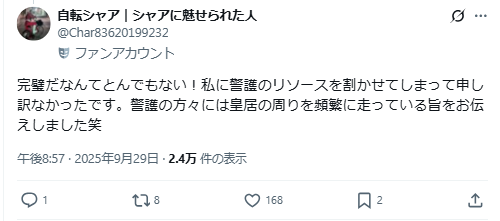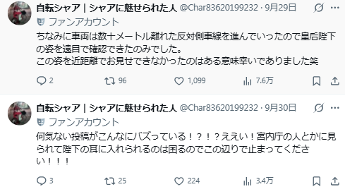 後來因為貼文越傳越廣,「自転シャア」也緊張地喊話:「這篇竟然爆紅成這樣!?請大家差不多就好,我可不想被宮內廳的人看到讓陛下知道這件事!」
