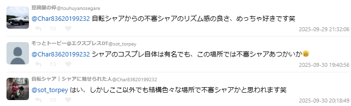 對此,自転シャア也謙虛回覆:「哪裡完美啦,我還讓人家浪費了警護資源,真的很不好意思。我也跟他們說明我平常常在皇居附近騎車啦哈哈。」
