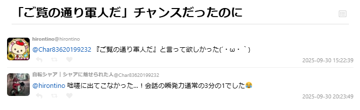 網友們的留言也笑翻一片:「你的應對真的太完美了!既展現對天皇的敬意,又讓警護人員知道你只是『可疑夏亞』而不是『可疑人士』(笑)」、「從『腳踏車夏亞』到『可疑夏亞』,這節奏太順太有梗了!」