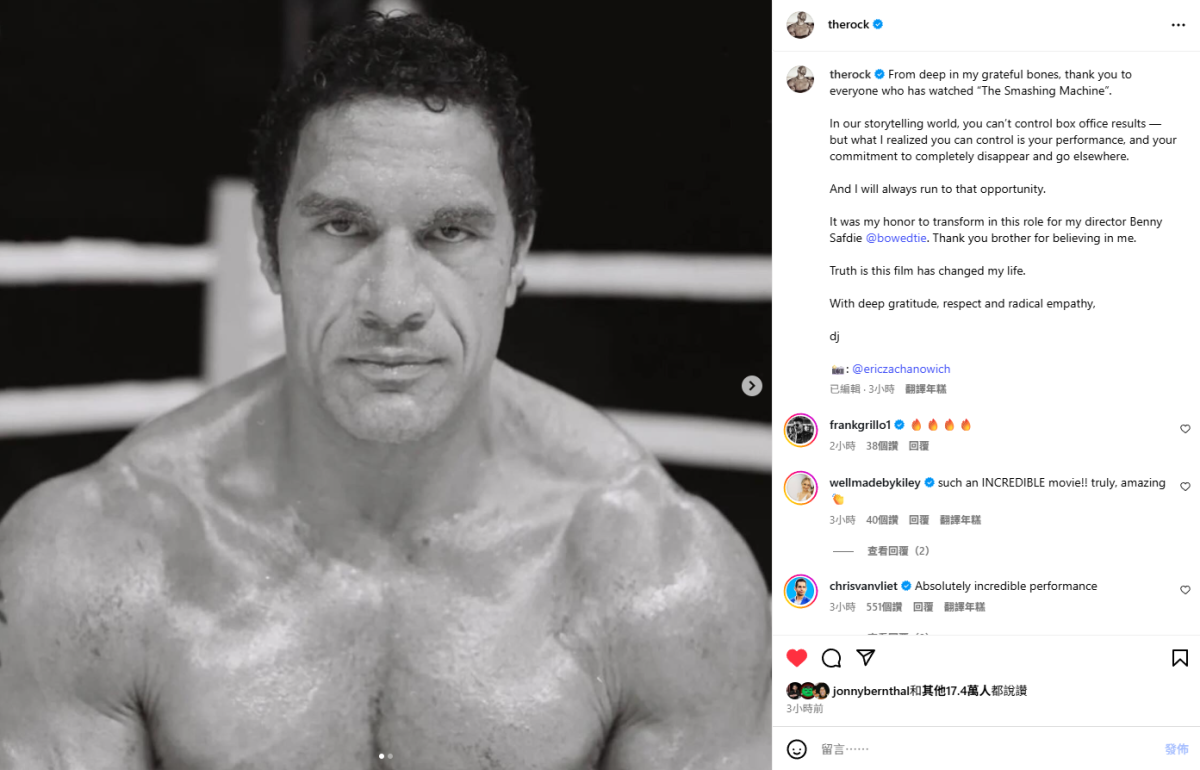 上週末,泰勒絲(Taylor Swift)將最新第 12 張專輯《星夢人生》(The Life of a Showgirl)的「發片派對」搬上院線,而且只限定放映三天,旋即吸引死忠歌迷進戲院朝聖,累積出全球 4600 萬美元的票房,並順利拿下北美的當週賣座冠軍。但同週上檔的巨石強森(Dwayne Johnson)傳記新作《重擊人生》(The Smashing Machine)就沒那麼好運,只開出 600 萬美元的數字。