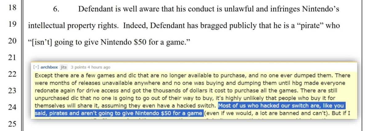 任天堂指出,Williams不僅是主要管理者之一,還擔任擁有19萬名成員的Reddit群組「SwitchPirates」的領導版主,長期發布數千則貼文鼓勵盜版,甚至公開徵求 eShop 禮品卡作為「捐贈」。此外,他還是名為「Missing Dumps」的社群唯一領導者,該群體專門以購買未被盜版的遊戲為目標,補齊盜版庫存。