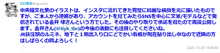 後續江口壽史本人在 X上發文,坦承「LUMINE 荻窪」的宣傳圖是「根據 Instagram 上看到的一張完美橫臉照繪製的」,後來發現確實是取自金井球的照片。 ( 該文已經刪除 )