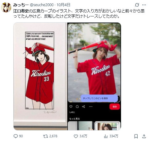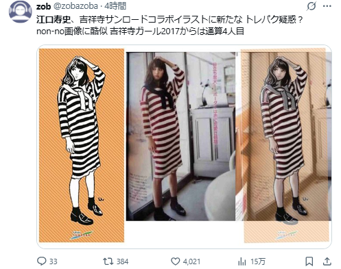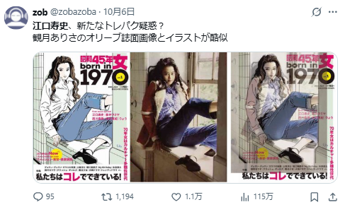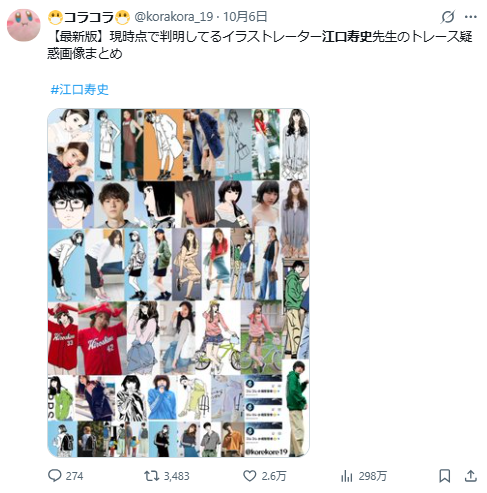 不過江口壽史卻在 10 月 3 日公開承認,自己為「LUMINE 荻窪」活動繪製的宣傳視覺,有未經允許參考社群人像照片。消息一出,網路上陸續有人指出他替其他企業或地方政府繪製的圖像也疑似「無授權使用」或「臨摹他人照片」,掀起網路軒然大波。