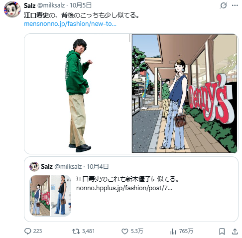這件事情燒起來後,許多網友發現江口壽史過去許多商業繪圖,完完全全都可以在流行雜誌、街拍照片甚至是網友在社群上分享的照片中,參考繪圖自行使用,這樣的習慣似乎已經行之有年。