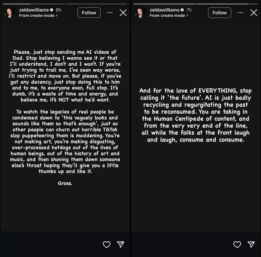 她進一步批評,AI生成文化正在侵蝕人類創作與尊嚴。看到真實人物的遺產被濃縮成「這大概長得像他、聲音也差不多」,只是為了讓人們在TikTok上製作那些噁心的傀儡影片,實在讓人憤怒。