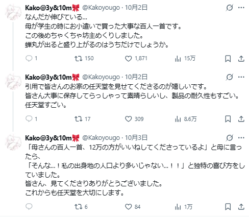 推主kako 回憶,小時候她和姊姊第一次看到這盒百人一首時,也曾驚呼「上面寫著任天堂耶!」結果爸媽笑著說:「那就是你玩的那個任天堂啦,是同一家公司喔~」,對這個家庭來說,它已經是傳承多年的「家族遊戲」了。這大概也是很多小孩的共同回憶吧(笑)。