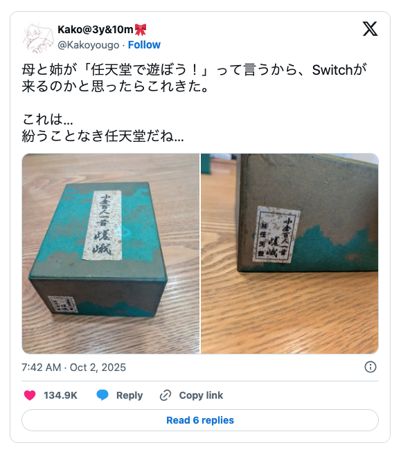 近日日本 X 上有位推主分享了一件關於任天堂的趣事,他在老家被媽媽和姊姊邀約「來玩任天堂」,結果以為是要玩電玩的預想下,卻看到家人拿出了一個「古老傳統遊戲」。也讓人想起任天堂當年的本業,引起網友熱議。