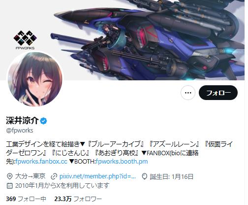 深井涼介參與過《蔚藍檔案》、《碧藍航線》、《假面騎士ZERO-ONE》,也參與過彩虹社與青桐高中的 VTuber設計,以及許多角色模型的設計,風格也深受許多粉絲喜歡。