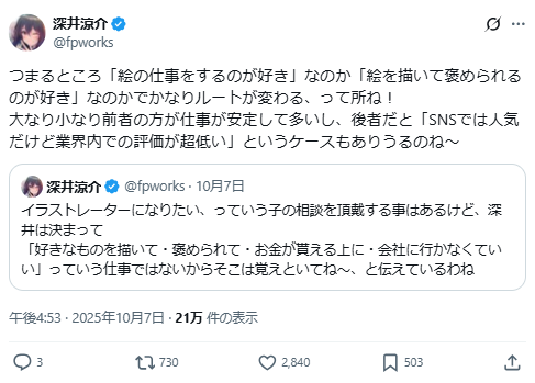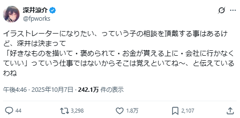 近日日本知名繪師深井涼介(@fpworks) 在個人 X發文,分享多年來面對年輕人詢問「該怎麼成為繪師」時的真實想法,也吸引不少業界跟有志往這方向發展的網友討論。