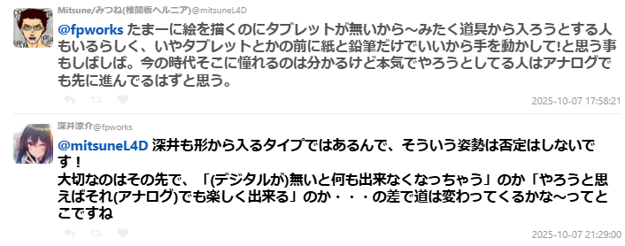有網友提到,有些人認為「沒有繪圖板就不能開始畫」。深井回應:「我自己也是會先準備器材的人,但重點不在工具,而在想法。是『沒工具就畫不了』,還是『即使用紙筆也能享受創作』,這會讓人走上完全不同的路。」
