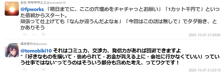 另一位網友提到,插畫案常常會遇到「幫我補這個洞、明天就要、1張1000日圓」這種臨時低價案,深井則表示:「這類情況,其實靠溝通能力、談判能力與自我發信力是可以避免的。所謂『不是隨便畫喜歡的東西就能賺錢』,也包含這層意思。」