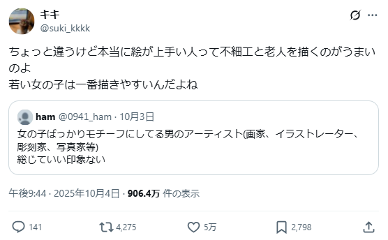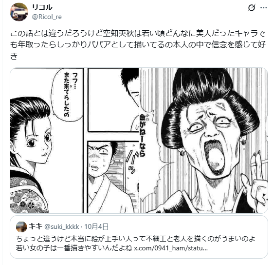 引起討論的推主發言指出:「畫功好的人,其實都特別會畫醜人和老人。因為年輕女孩是最容易畫的題材。」這番話得到大量網友認同,畢竟這種人物要畫得好並不容易,還得在其中展現出特色又須在審美觀上讓大家信服。