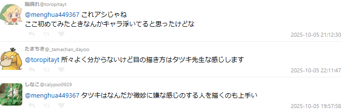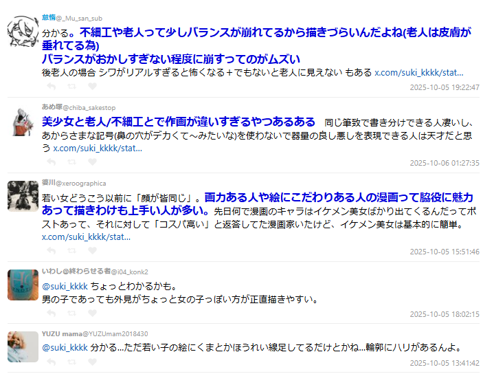 有創作者回應說:「老人臉最難畫,皺紋太寫實會變恐怖、太少又不像老人,拿捏很難。」也有人表示:「真正厲害的畫家,不靠誇張記號(例如鼻孔變大、眼睛塌陷)就能區分角色氣質,這才是真功夫。」