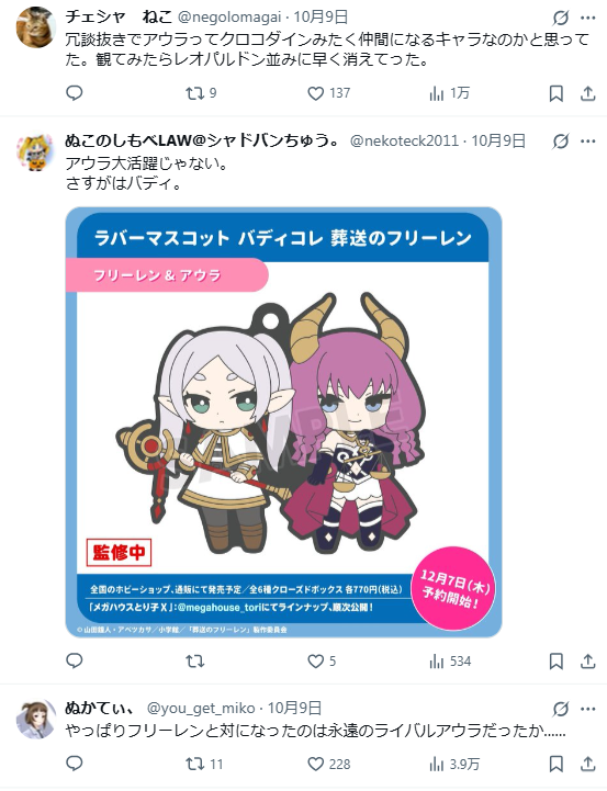 雖說『斷頭台阿烏拉』不管在漫畫還在動畫,其實登場的篇幅都非常有限,甚至只是過場的一個魔族 boss 而已,但依靠動畫播出的渲染力,以及可愛又狂氣,甚至是自虐被迫害的屬性,讓不少粉絲看到這個角色就入坑。甚至還在官方第二回投票僅次欣梅爾成為第二名,還被粉絲開玩笑「阿烏拉是旅行夥伴」。