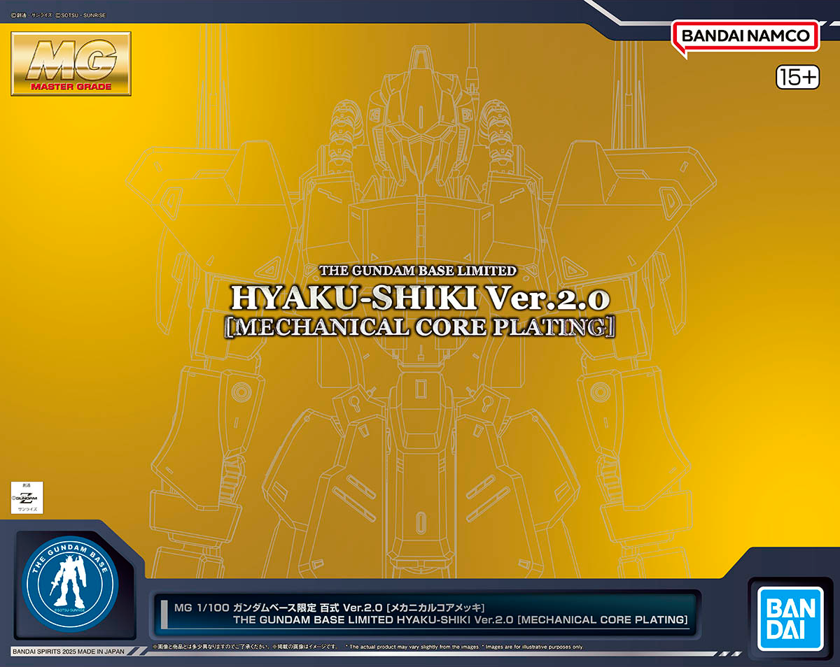 「MG 1/100 百式 Ver.2.0[機械核心電鍍]」基於過去推出的一般版修改而來,原本施以香檳金電鍍的外裝甲改為透明零件,並在零件內側進行銀色蒸鍍加工使細節造型徹底浮現,透過融合透明光澤、金屬質感的特殊風格表現百式的金色裝甲。此外商品外盒也採用大片金色印上百式機體線稿的新設計,表現出極為豪華的質感。