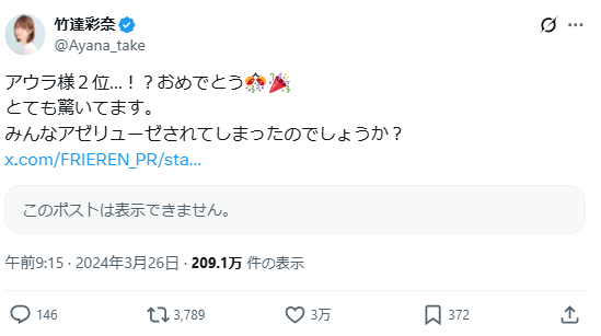 ▼ 2024年官方舉辦第二回投票時,阿烏拉獲得第二名竹達彩奈也發文恭賀。