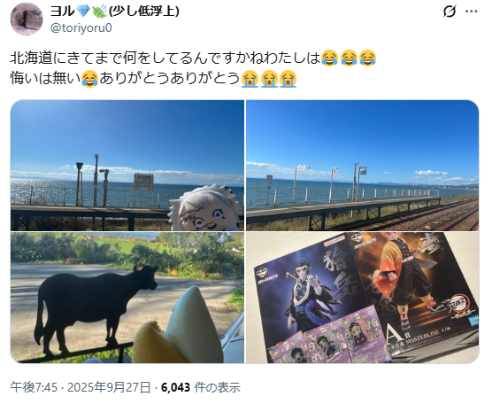 這起事件是推主ヨル(@toriyoru0),在北海道旅行時發現剛上市的一番賞,雖然自己也吐槽「都來北海道了我在幹嘛啦」,但還是手癢去抽,結果直接抽中A賞和B賞——也就是善逸與獪岳的模型!結果這兩隻模型,卻成了事故的開端。