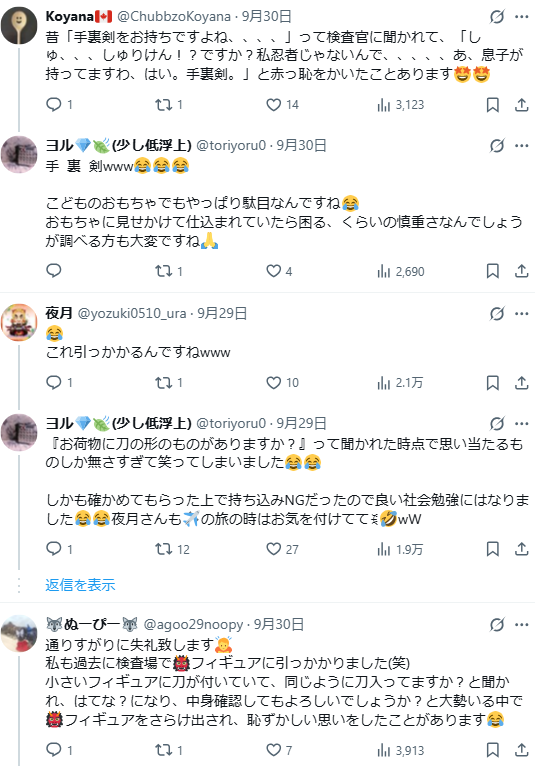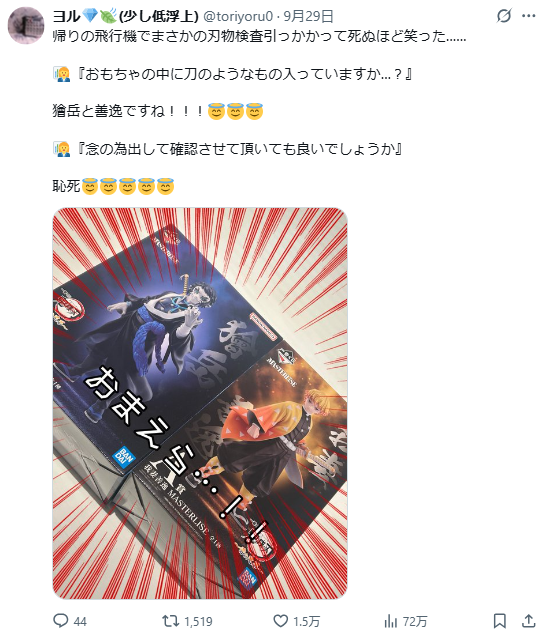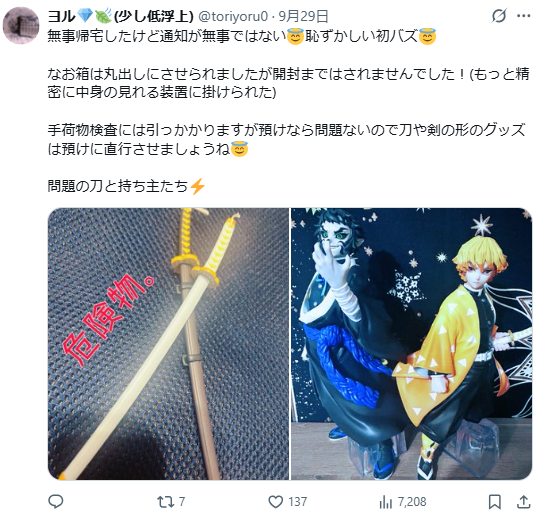 這突如其來的插曲讓ヨル本人又尷尬又好笑,她在貼文中笑說:「真的太糗了,自己都笑出來!」,雖然後續一切安好出關,但這個經驗讓她大感爆笑,還附上了所謂危險物的日輪刀,跟善逸與獪岳模型的照片。