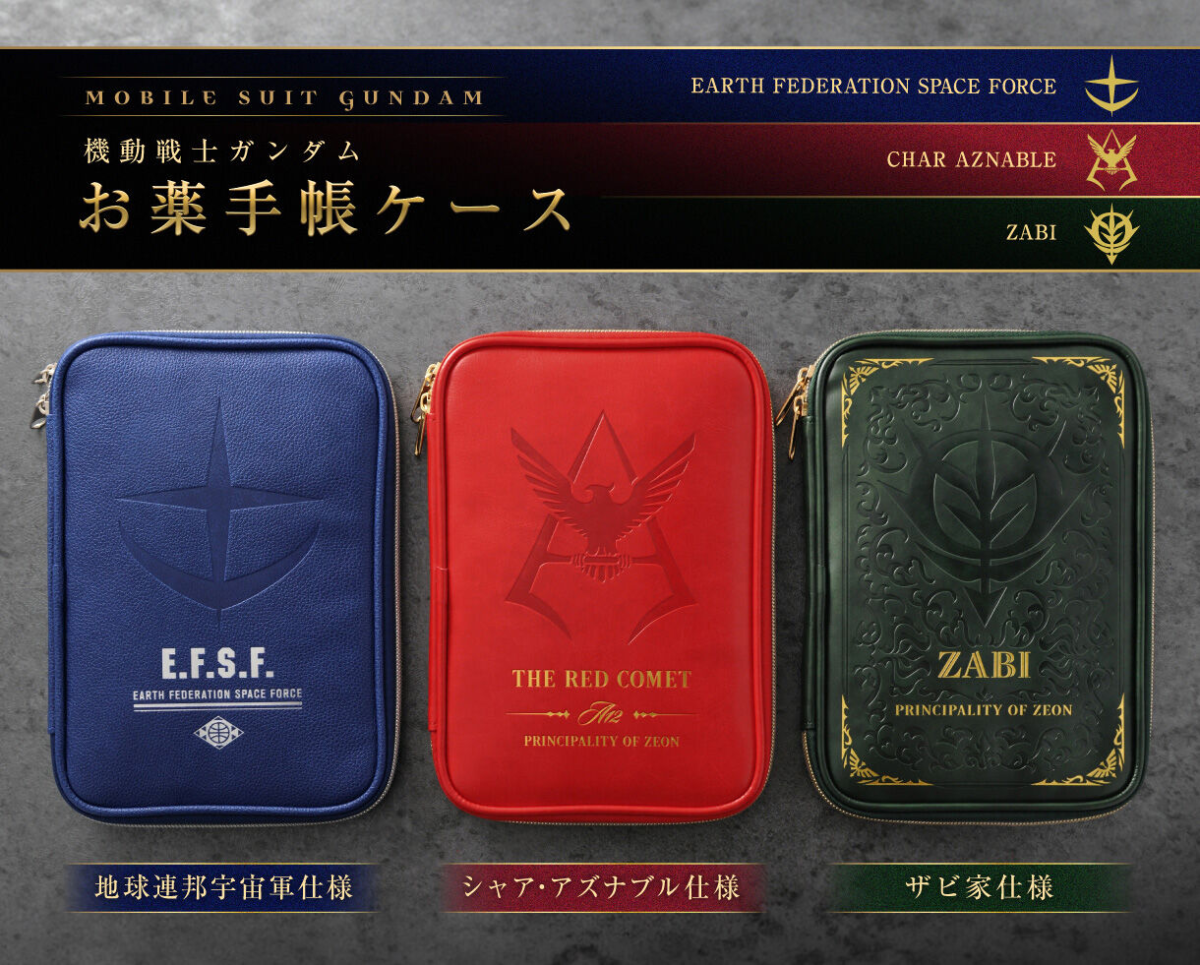這次推出的藥袋收納夾共三款:地球聯邦軍款、夏亞・阿茲納布爾款以及薩比家款。每款封面都壓印了專屬的徽章與個人標誌,並以低調的金屬光澤與穩重配色呈現,質感滿滿又不突兀,日常使用也很合適。
