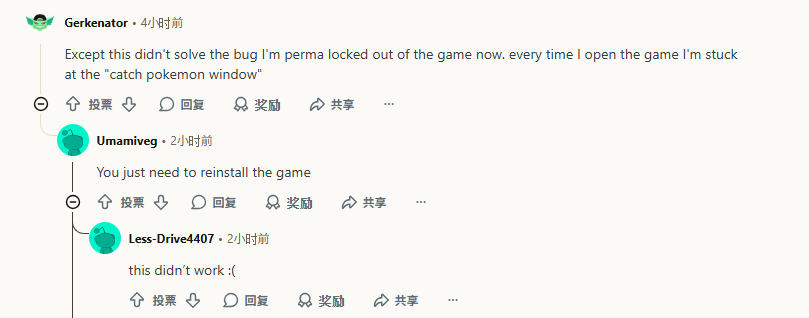 不過,即使該活動已被停用,部分受影響玩家仍無法恢復正常遊玩,顯示此次錯誤不只是前端顯示問題。許多玩家在Reddit社群「TheSilphRoad」表示,無論重新啟動、刪除或重裝遊戲,問題仍持續存在。