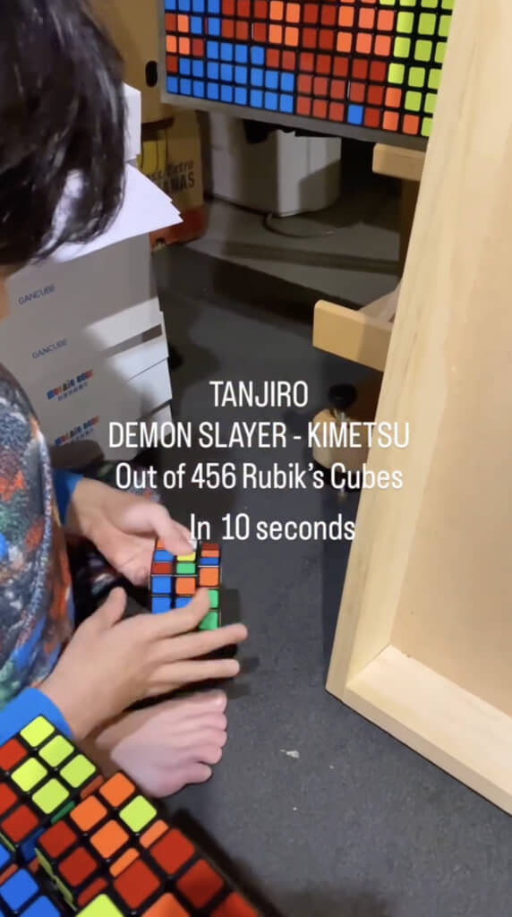他們的作品並不是用筆或顏料,而是用我們熟知的「魔術方塊」來創作。這次他們挑戰的是《鬼滅之刃》主角「竈門炭治郎」,用色塊排列出他那雙充滿堅毅眼神的臉。