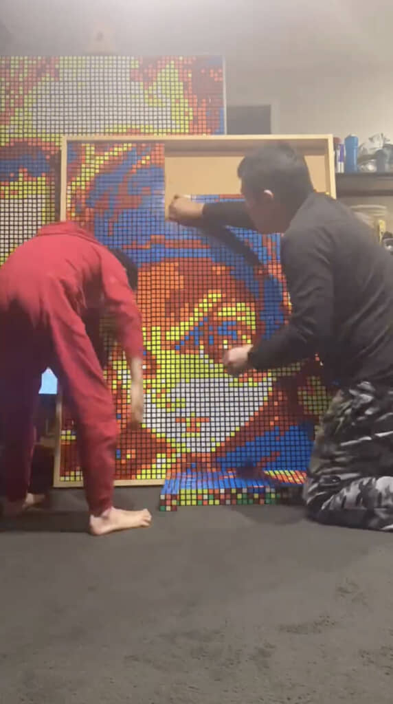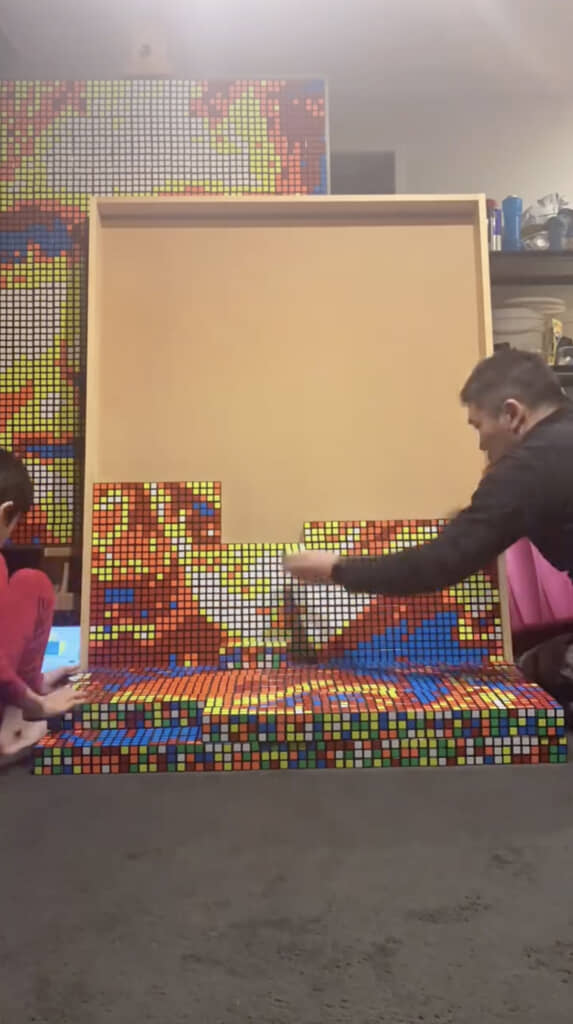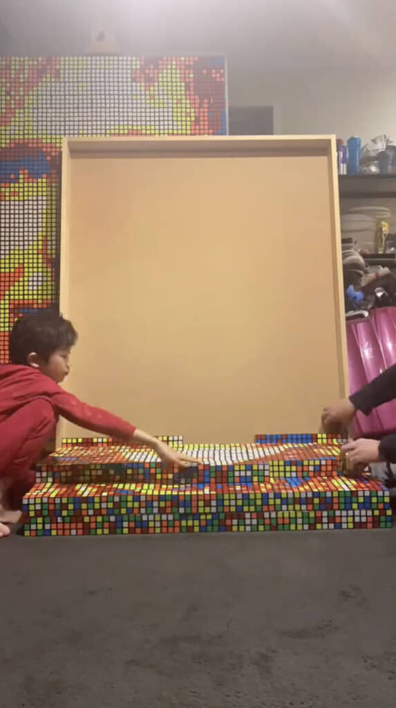父子倆先準備了超過400顆魔術方塊,仔細把每一顆都轉到預定顏色,然後一個個放入大木框中排列。