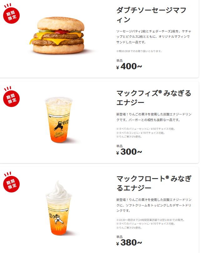除了主餐系列,早餐時段限定的「雙層起司香腸滿福堡」也同步登場,搭配新推出的「搖搖薯條 上癮風味主廚濃湯口味」與「能量系氣泡飲『McFizz/McFloat 充能能量』」,讓你早餐也可以美味無比。