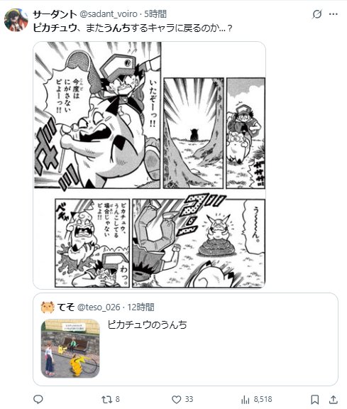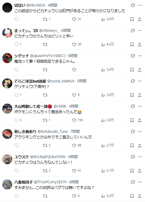 不過在日本 X上竟意外掀起話題的——居然是「皮卡丘在遊戲裡便便」的NPC對話片段被玩家分享,結果「皮卡丘的大便」瞬間衝上熱搜,成為網友話題。