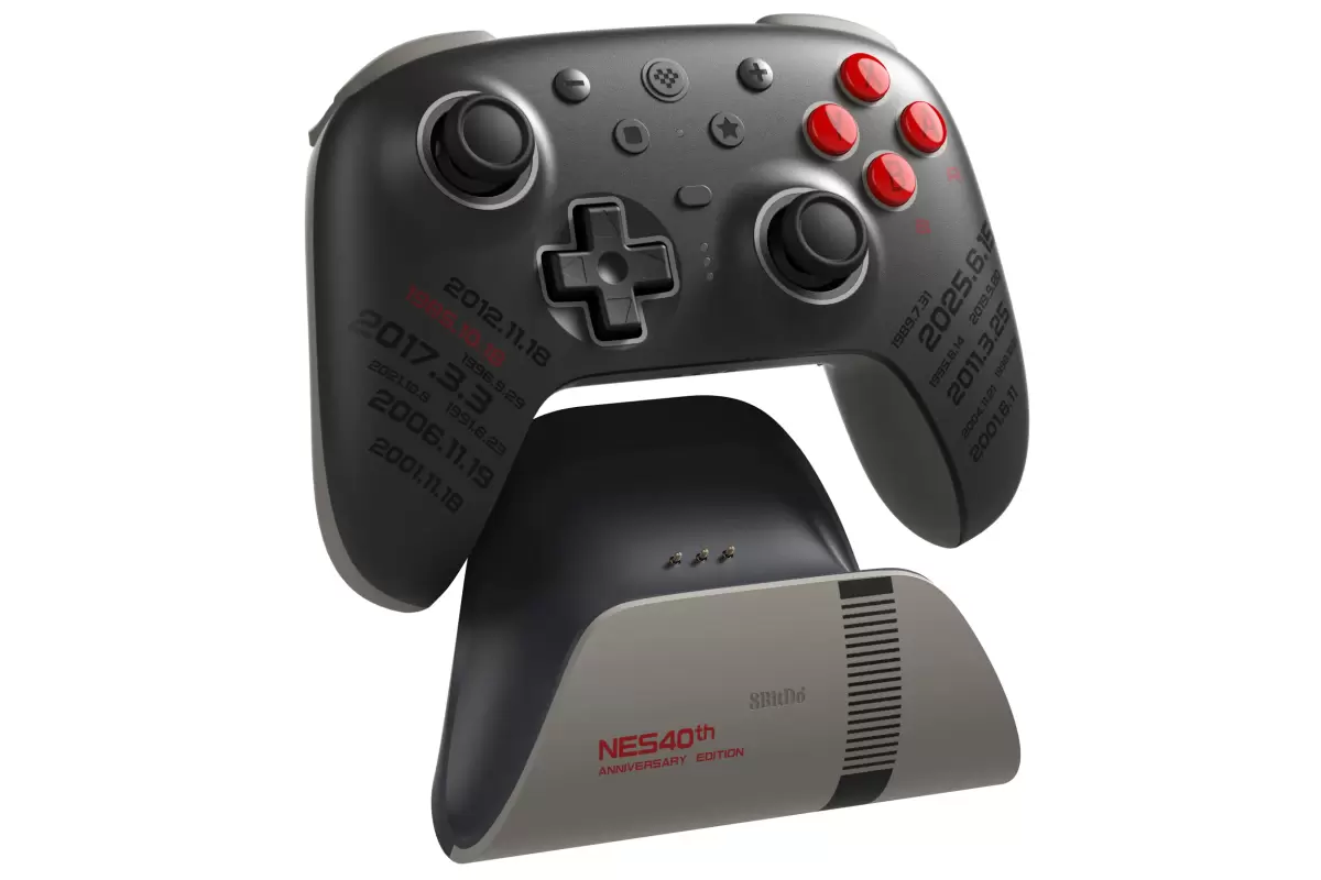 當中最具代表性的無疑是Ultimate 2無線控制器N40版,該版本以NES經典配色重新設計外觀,並隨附充電底座與四種可替換搖桿帽。握把上特別印有多個年份,紀念任天堂與8BitDo歷年重要產品的發表時刻。