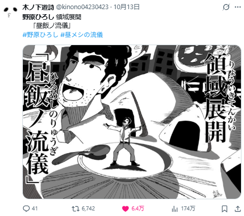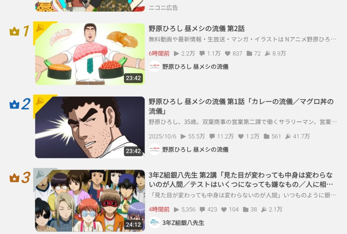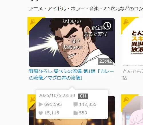 截至10月15日,《野原廣志午餐的流派》第一集〈咖哩的流儀/鮪魚丼的流儀〉的播放次數已突破 69 萬次,留言更高達 14 萬則,一舉拿下 Niconico 總榜第一的寶座。