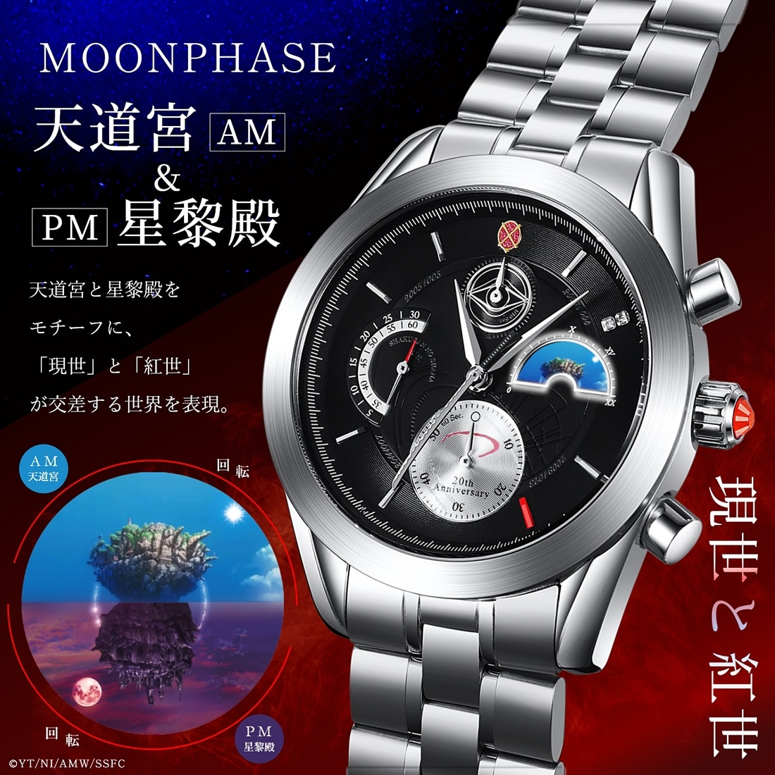 錶盤象徵紅世與現世交錯的「月相盤」,月相顯示部分以「天道宮」與「星黎殿」為主題,透過盤面下方的轉動圓盤,隨時間緩緩變化,重現《夏娜》世界裡紅世與現世交融的氛圍。