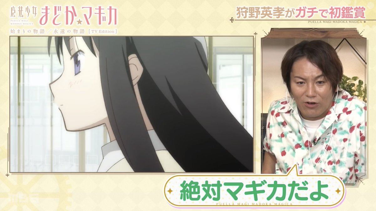 上週第1集播出時,狩野看到主角鹿目圓登場便自信地猜:「應該是那種一開始不會用魔法,後來慢慢修練成功的故事吧?」還被標題誤導,看到神祕轉學生小焰出現時說:「這個孩子是『マギカ』吧?一定是吧!咦?不是?她叫焰??」整個滿頭問號。