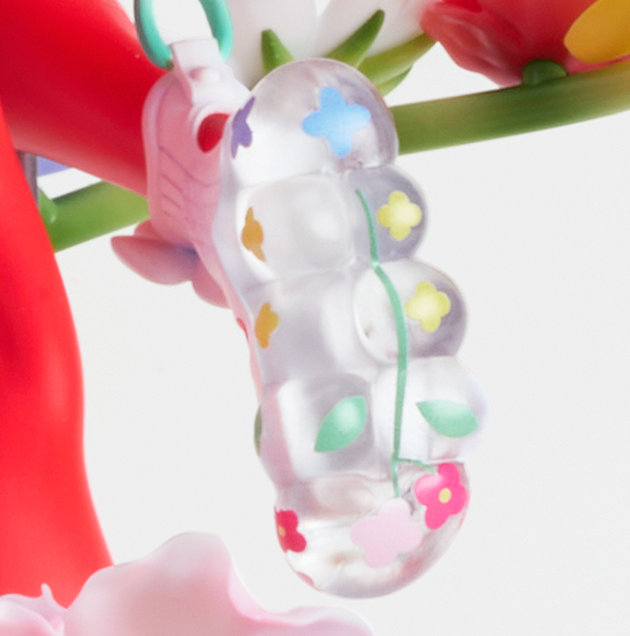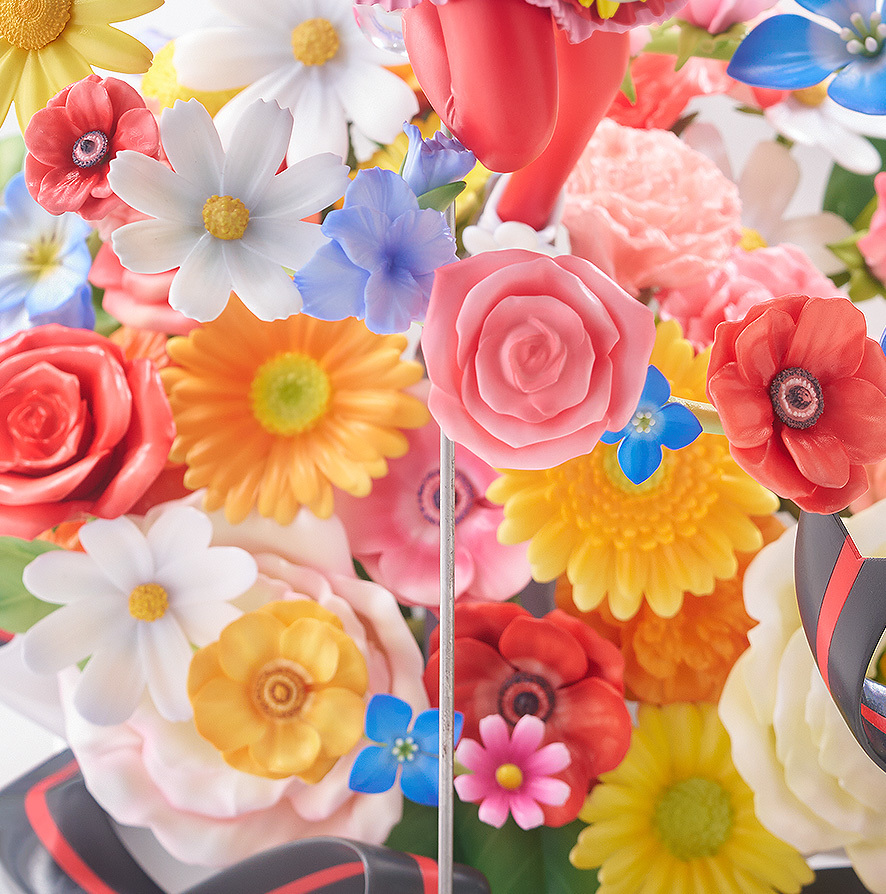 彷彿從花束中飛躍而出的姿勢,服裝細膩的設計與緞帶、髮絲的流動,充滿躍動感!搭配透明零件的使用,營造逼真的質感。