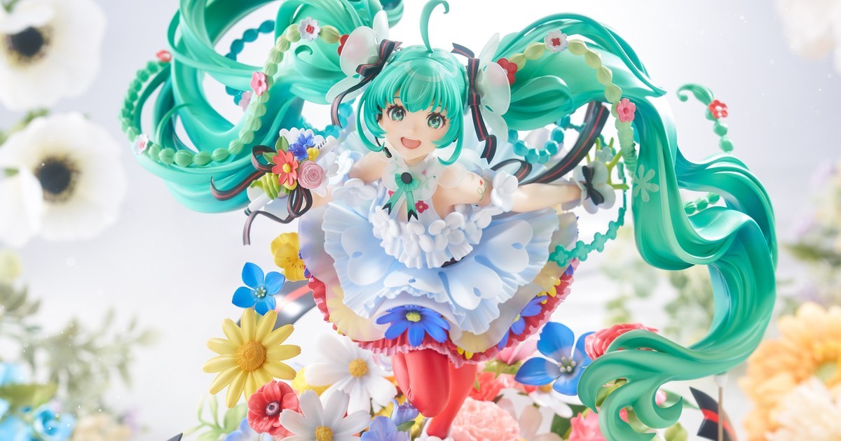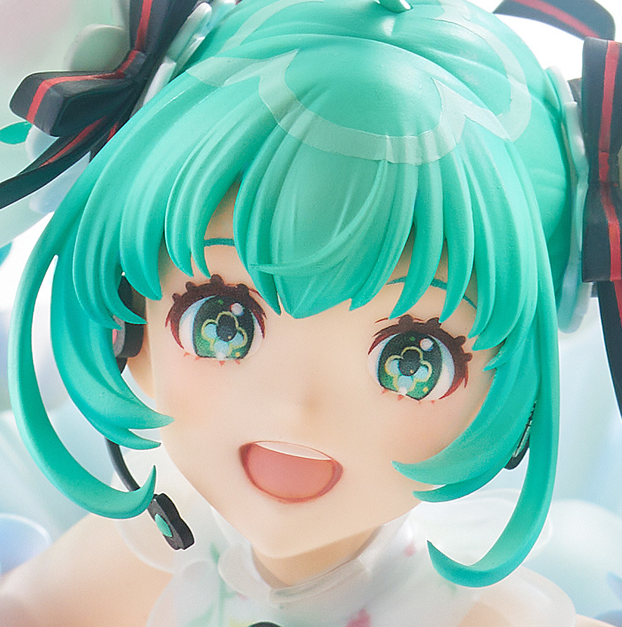 尺寸約高 32 公分,還原初音惹人憐愛的元氣笑容,透過豐富的色彩與光澤、細膩漸層等塗裝技法,表現出插畫中鮮花燦爛綻放的氛圍。