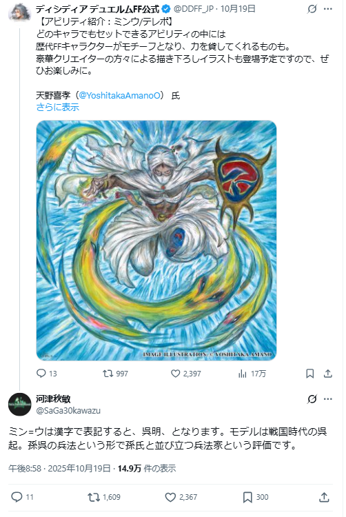這次的驚喜揭露,起因於即將推出的新作手機遊戲《DISSIDIA DUELLUM FINAL FANTASY》官方 X 帳號發布了一張關於敏武「傳送(テレポ)」技能的介紹圖文。身為FF出代與FF2的戰鬥系統設計師河津秋敏回應了該貼文,並補充了這段塵封已久的設定。