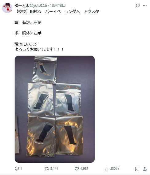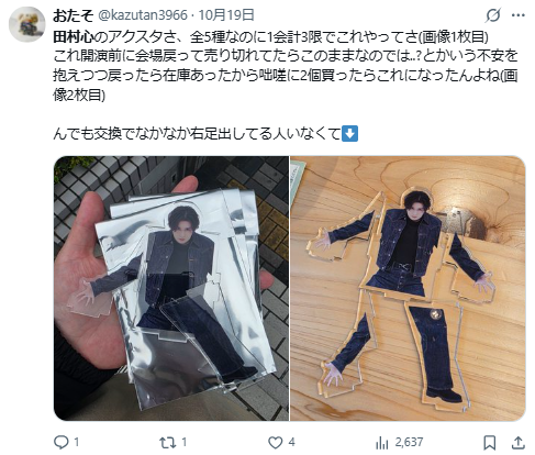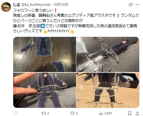 近日日本男星田村心,推出了自己三十歲的紀念週邊商品,其中有款「組立式立牌」,因為跟《遊戲王》的「被封印的艾克佐迪亞」一樣分為五份隨機抽,這樣的搞怪設計也形成粉絲在網路上交換部件的奇葩現象,連田村心自己都吐槽成意外成為話題。