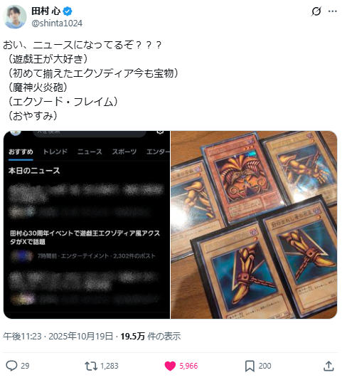 結果這現象引起話題後,連田村心自己都Po文吐槽自己,沒想到話題變成這樣,坦承自己的確很愛《遊戲王》也還有收藏五張「被封印的艾克佐迪亞」當作寶物,還知道艾克佐迪亞的絕招名「魔神火炎砲」,看來是存心想玩梗無誤阿 www。