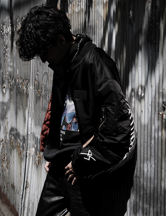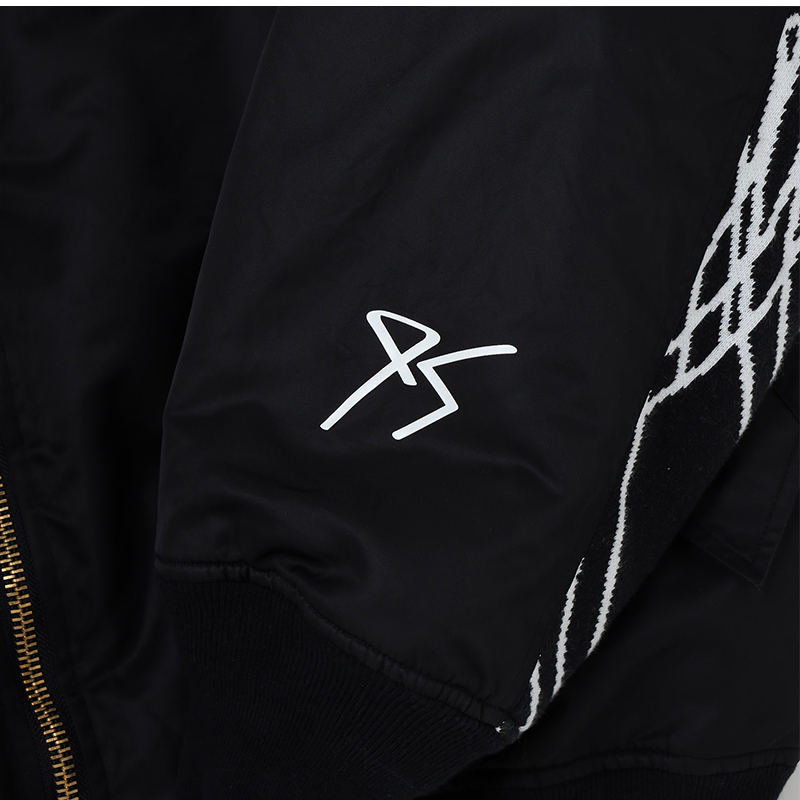 兩袖以 A.T力場共鳴為靈感,採用提花針織方式呈現獨家的原創圖樣,並在袖口印上品牌代表圖示 「95」。整體剪裁參考 ALPHA MA-1 飛行外套,結合原創版型,維持經典的方正輪廓與適中厚度。