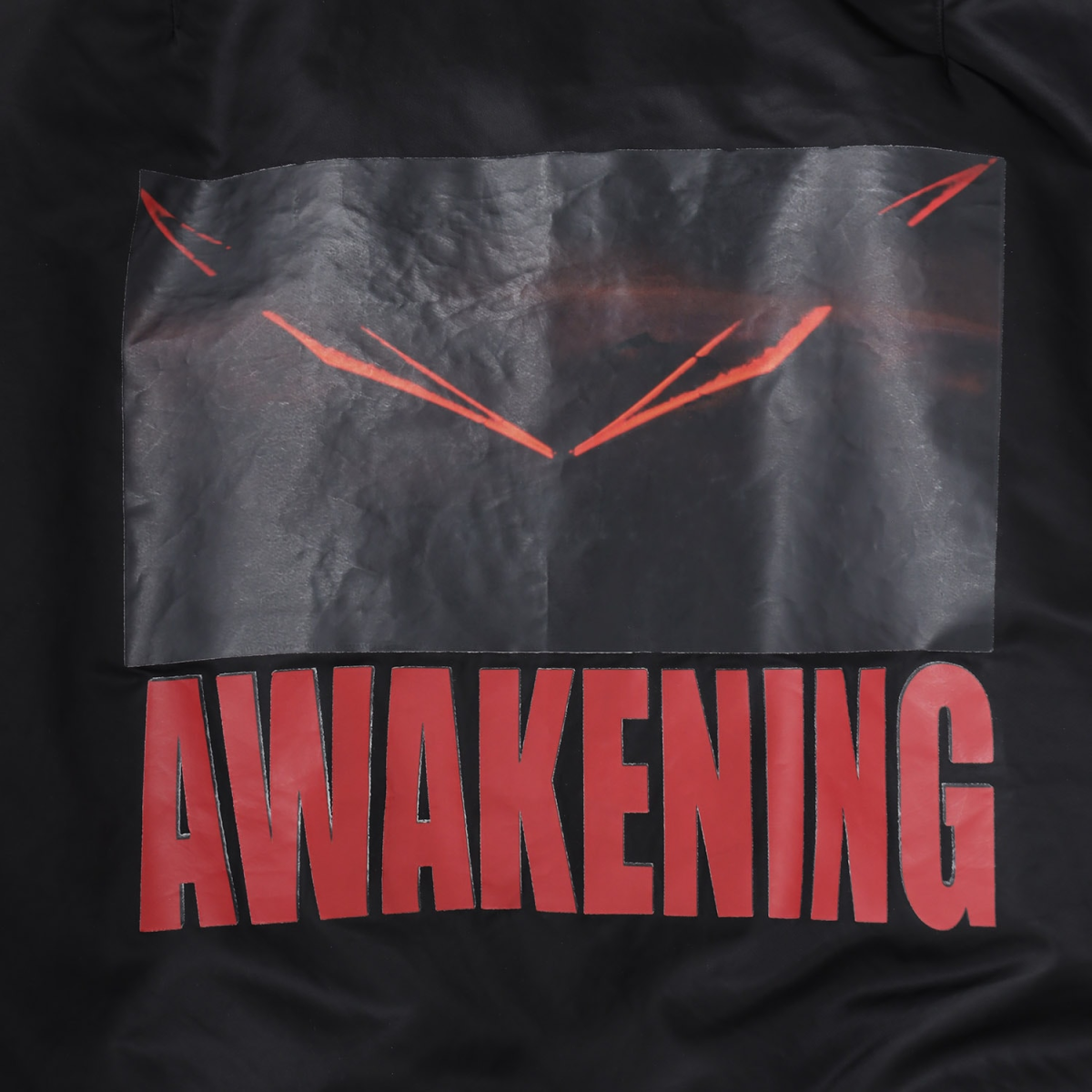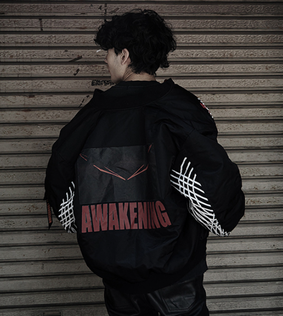 這次的MA-1外套以「初號機覺醒」場景為主題設計,整體散發濃厚的終局氣息。外套背面印有極具衝擊力的 「AWAKENING(覺醒)」 字樣,帶出劇中強烈的精神意象。