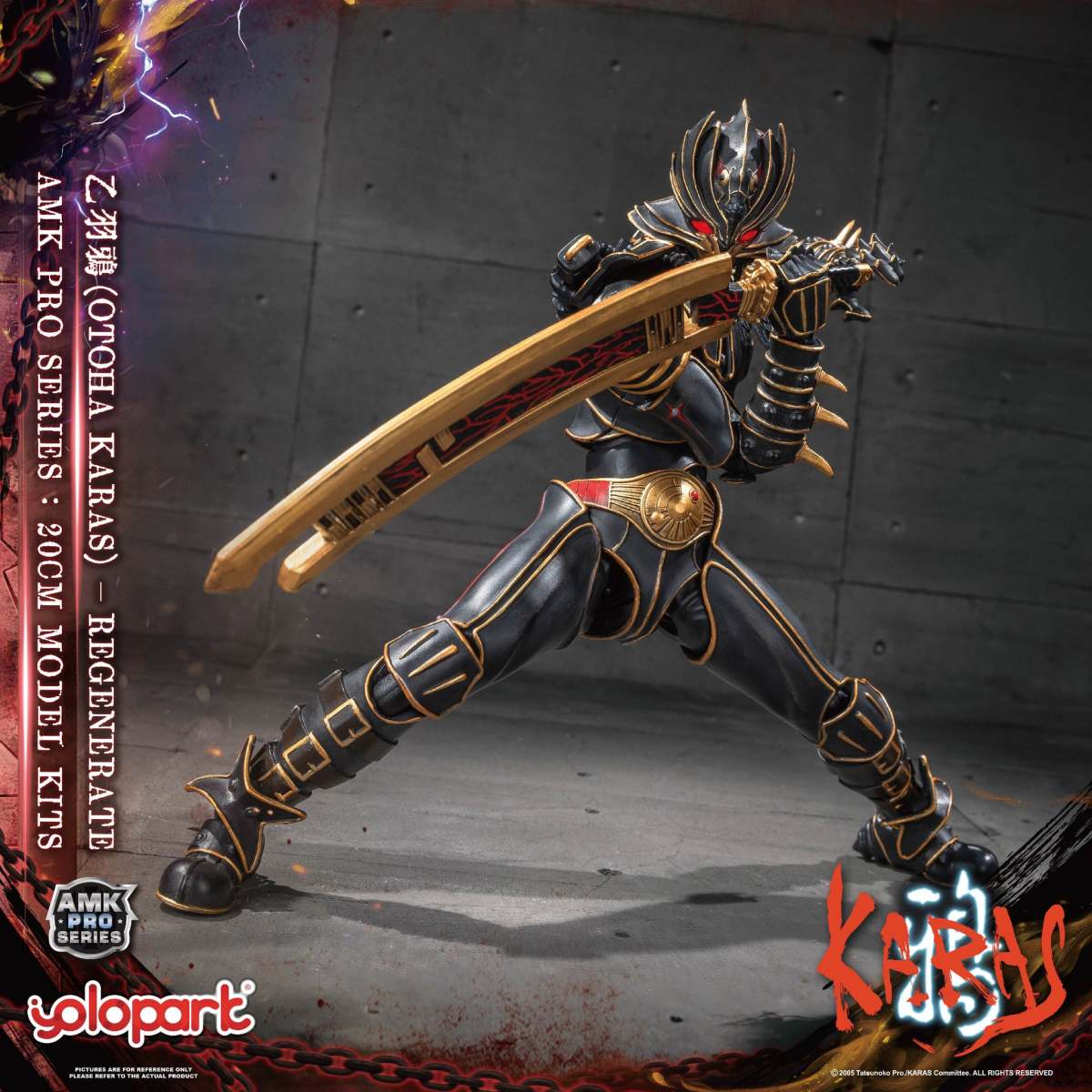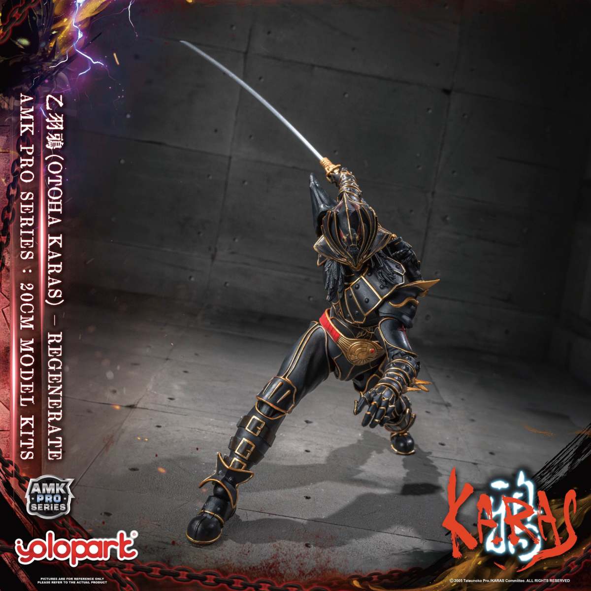 本次的 AMK PRO「乙羽鴉– 重生」高約 20 公分,採用的是乙羽在最終決戰重生後的盔甲造型,雕刻再現盔甲上的各種細節,細膩的塗裝出金、紅色花紋,標誌的紅色眼睛內建 LED 發光機構,可以開啟再現乙羽鴉在劇中的視覺效果!配件部分附有武士刀 、升級後的武士刀、專用刀鞘以及四款替換手,可以配合靈活的可動再現最終決戰的各種魄力動態!此外還收錄了羽毛披風配件,細膩地呈現羽毛紋理等細節,能夠裝備在乙羽鴉的肩上,展現登場時的霸氣模樣!