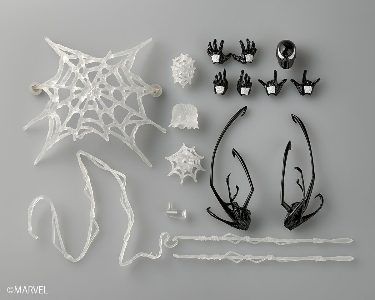 配件部分收錄有三組替換手、一顆替換頭雕、一對可以安裝在後背上的共生體特效,以及多種造型的半透明蛛網特效,可以配合山口式關節系統靈活的可動性擺設出各種高難度的動態!此外這次在海洋堂指定通路預購還將附贈一顆被共生體侵蝕、眼睛變得像猛毒一樣的替換頭雕,增添把玩的豐富度!