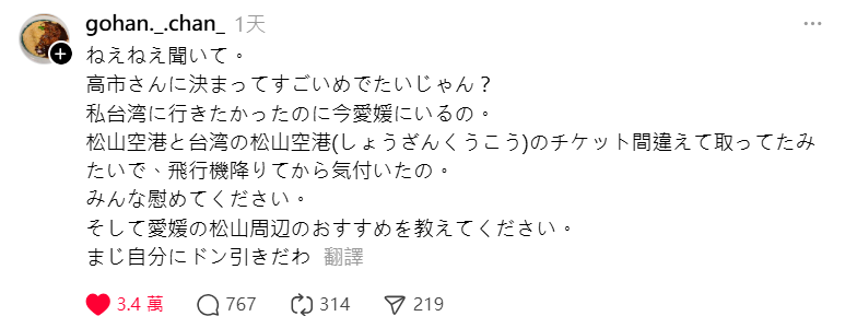 由於他搭的是國內線,沒有辦理出國手續,加上飛行時間很短,他一路都沒發現異狀,直到抵達後才發現根本沒出國。因為目的地「台北松山機場」,誤買成飛往「日本愛媛縣松山機場」的機票,都是松山...沒什麼不同吧。目前他已經「順勢」開始享受愛媛之旅,但這個經歷也讓許多網友噴飯大笑。