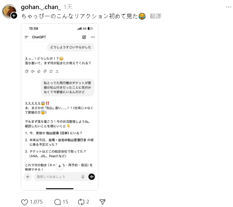 不過近日在Threads上,有名33歲的日本網友,靠著ChatGPT安排行人生第一次海外旅行,結果卻鬧出笑話——他原本想飛去「台灣松山機場」,卻誤買成飛往「日本愛媛縣松山機場」的 ANA 機票。分享在Threads也引起話題,甚至連「台北駐日經濟文化代表處」也幽默響應這個趣聞。