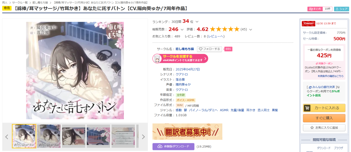 クアトロ所製作的,是由人氣同人配音陽向葵優花( 陽向葵ゅか )配音演出,由他撰寫劇情的ASMR作品「あなたに託すバトン」,在DLsite上面專賣,以生命為題材的劇情獲得不少好評。