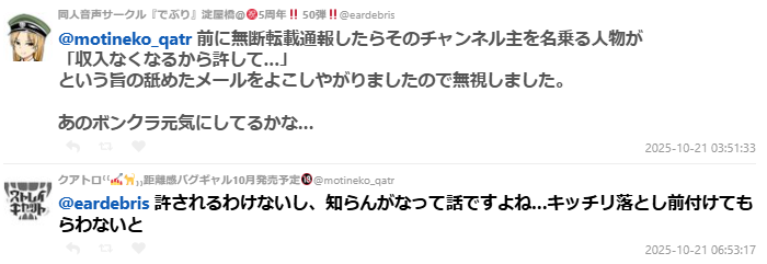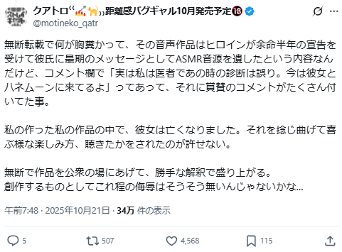 日本同人音聲創作者クアトロ(Quattro) 近日在 X上公開表示,自己製作的ASMR聲音作品,遭到中國影音平台Bilibili的網友無授權上傳,並在留言區親自回應盜轉者,卻得到令人傻眼的回應,分享在X上後對於這種無斷轉載的行為,引發網友討論。