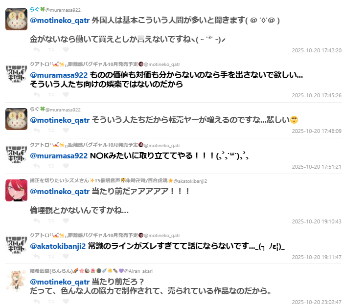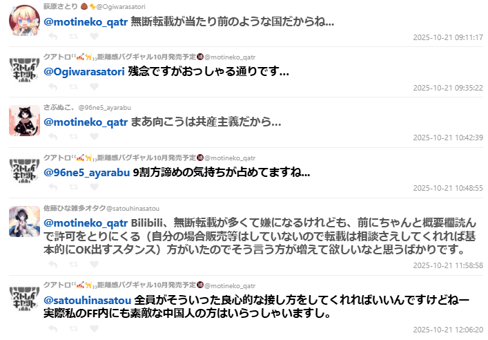 不少日本網友將焦點放在「文化與價值觀差異」上:「中國那邊盜版真的太普遍了。」、「共產思想什麼的都是藉口,根本是道德問題。」不過クアトロ也補充說:「我也有中國粉絲很守規矩、會支持正版,只是這樣的人真的太少了。」
