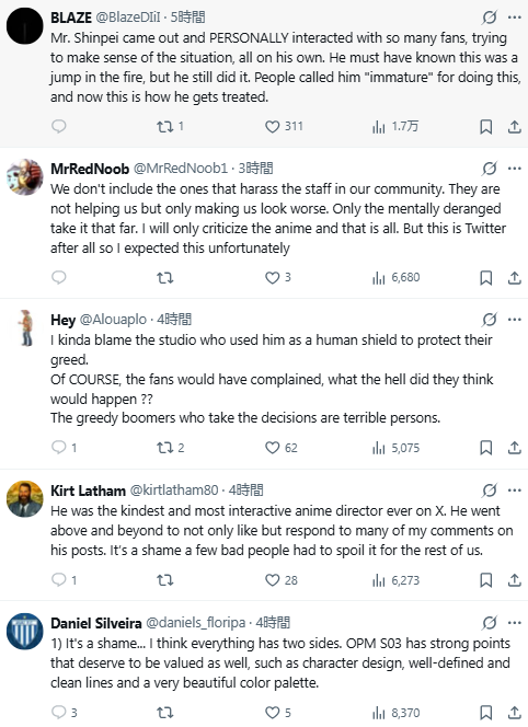 海外網友也表示,因為永居導演會跟粉絲互動,希望替粉絲釐清狀況,但似乎反倒變成擋箭牌,其實從業人員這樣的互動並不安全。現在狀況也發生了,動畫品質不好不完全是他一個人的責任,卻變成坦下砲火的人。