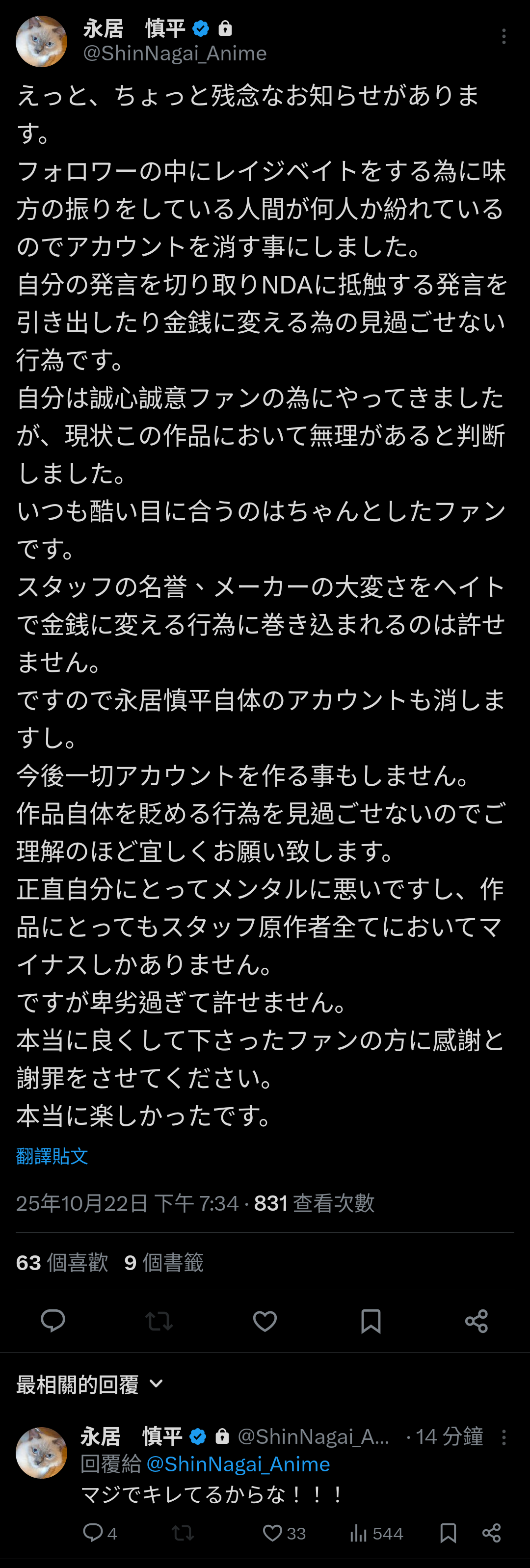 當然這樣的情況,也讓不少粉絲擔憂永居慎平的身心狀況,畢竟遭到這樣的社群紛擾,對於還要從事動畫工作這種勞心勞神的職業來說可是更加難熬。