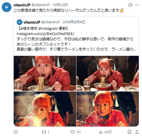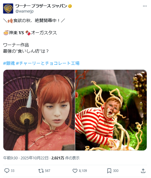其實這篇貼文的由來,是因為華納日本官方帳號趁著「食慾之秋」發了一則互動貼文,問大家「《銀魂》的神樂」和「《巧克力冒險工廠》的奧古斯塔·格盧普」,誰才是最強大胃王?福田導演看到後,就順勢曬出這張橋本的爆笑幕後照。